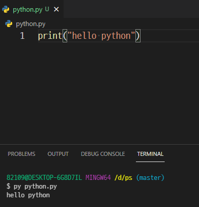 $ py + 파일명(파일은 OOO.py 와 같이 .py 확장자로 만들어야한다.)