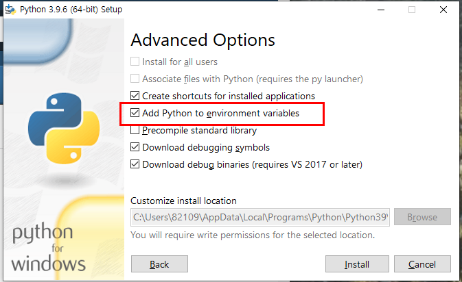python을 환경변수에 추가할 수 있으므로 꼭 추가해서 설치한다.